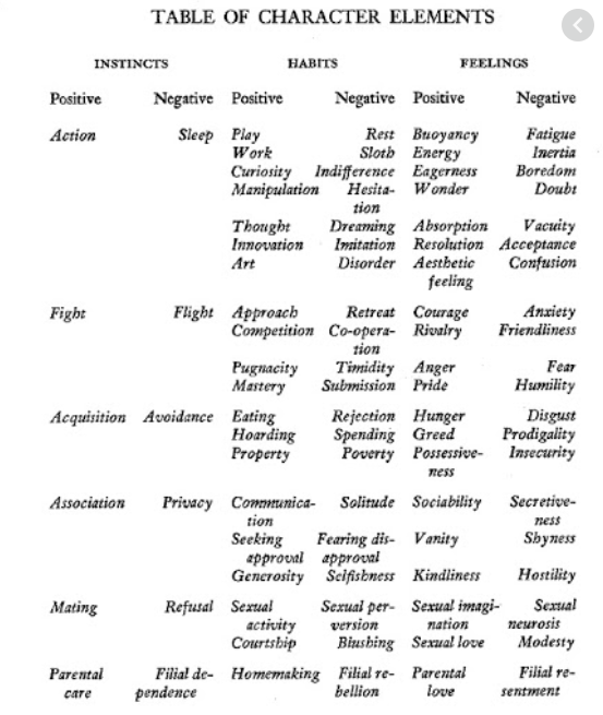 We may define human nature as the fundamental tendencies and feelings of mankind. The authors go on to bring in and introduce us to the “Table of Character Elements”.