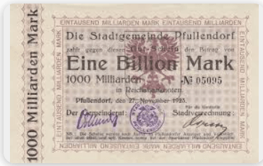 The new stable currency, the Rentenmark, would only be introduced in November 1923 under Chancellor Stresemann at the following exchange rate: 1 Rentenmark vs. 1.000.000.000.000 Mark. This effectively meant that it had eliminated a war bond sold previously to its people to become worthless. The only people that came out less scathed were people that had foreign currency or hard assets (house, precious metals, home decorations, food, etc.)