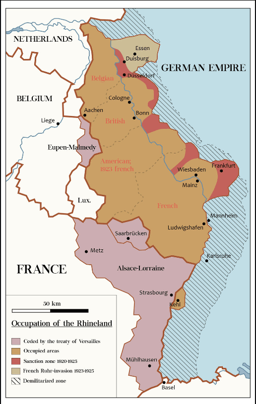 Germany struggled to meet its reparations payments, because its money became devalued in parallel. In the final months of 1922, the British and U.S.A. were coming to acknowledge that it was struggling and were willing to extend a hand. France, however, believed that Germany was not telling the truth of its struggles and was rather trying to get out of paying. Therefore, France and Belgian forces moved and occupied the Rhine territories (Essen, Dortmund, Duesseldorf, etc.), where Germany had its raw material mines, in January 1923. Considering the political tensions in the country, it easy to understand why this act played into the hands of political groups of the left and right that wanted to take over from the social democrats.